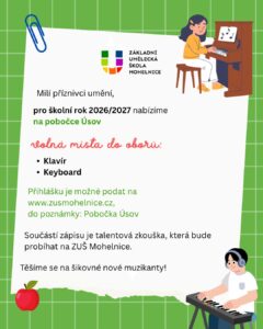 Pro školní rok 2026/2027 nabízíme na pobočce Úsov volná místa do oborů klavír a keyboard. V případě zájmu prosím do přihlášky uveďte poznámku „pobočka Úsov“.
