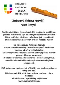Hra na zobcovou flétnu nejenže rozvíjí hudební cítění, ale také jemnou motoriku a dýchání – nebojte se tedy přihlásit své dítě k nám na ZUŠ!